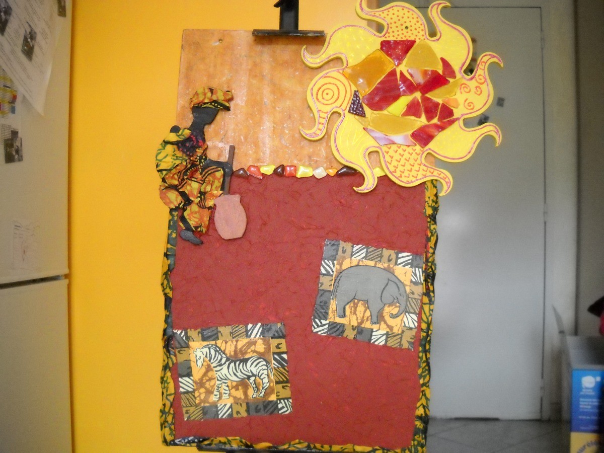 Tableau africain fait sur une petite planche de bois de 30/48 cm.Le fond est fait en peinture en relief, papier banane, décopatch motif afrique et mosaïque.Le tableau est bordé par un tissus africain rigidifié. Le soleil a été peint en peinture acrylique et colle en relief. Son centre est fait en tesselles de verres. La silhouette de la femme africaine a été peinte et habillée en tissus africain rigidifié. Pièce unique.