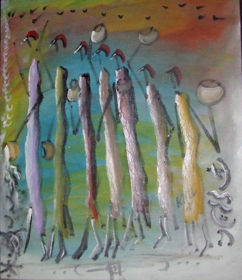 Peinture de Amadou Fatoumata BA. Dans la tradition africaine, il est recommandé de faire des sacrifices régulièrement. Au sénégal, cette tradition, malgré l'islamisation, a été maintenue. Nous sacrifions : sucre, lait, mouton et autre en fonction des demandes des "marabouts" ou "sorciers". Huile et acrylique sur toile. Dimension 70 x 59.