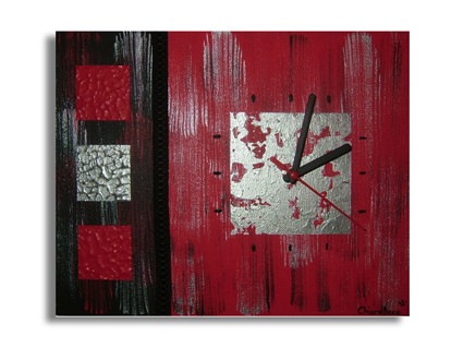 Tableau Horloge Moderne, rouge, noire et gris argent Dimensions : 30cm x 24cm Acrylique sur chassis toilé avec ruban et système d'horloge à pile Disponibilité : sous 10 jours après réception du règlement Création Personnelle de chiaradeco