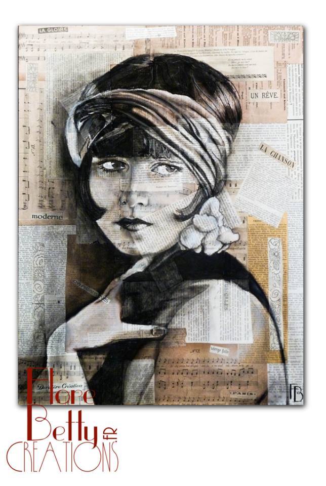 Portrait de Louise Brooks sur coupures papier de revues musicales et journaux des années 1920. Fusain, craie et acrylique sur papier journal. Née au Kansas en 1906, Mary Louise Brooks est une actrice de cinéma connue pour ses rôles dans les films muets des années 20 aux Etats-Unis. De ses cheveux d'un noir d'ébène, à la coupe si singulière, naîtra la mode "garçonne". Après un passage dans une compagnie de danse moderne, elle intègrera en 1925 les Ziegfeld Follies (l'équivalent new-