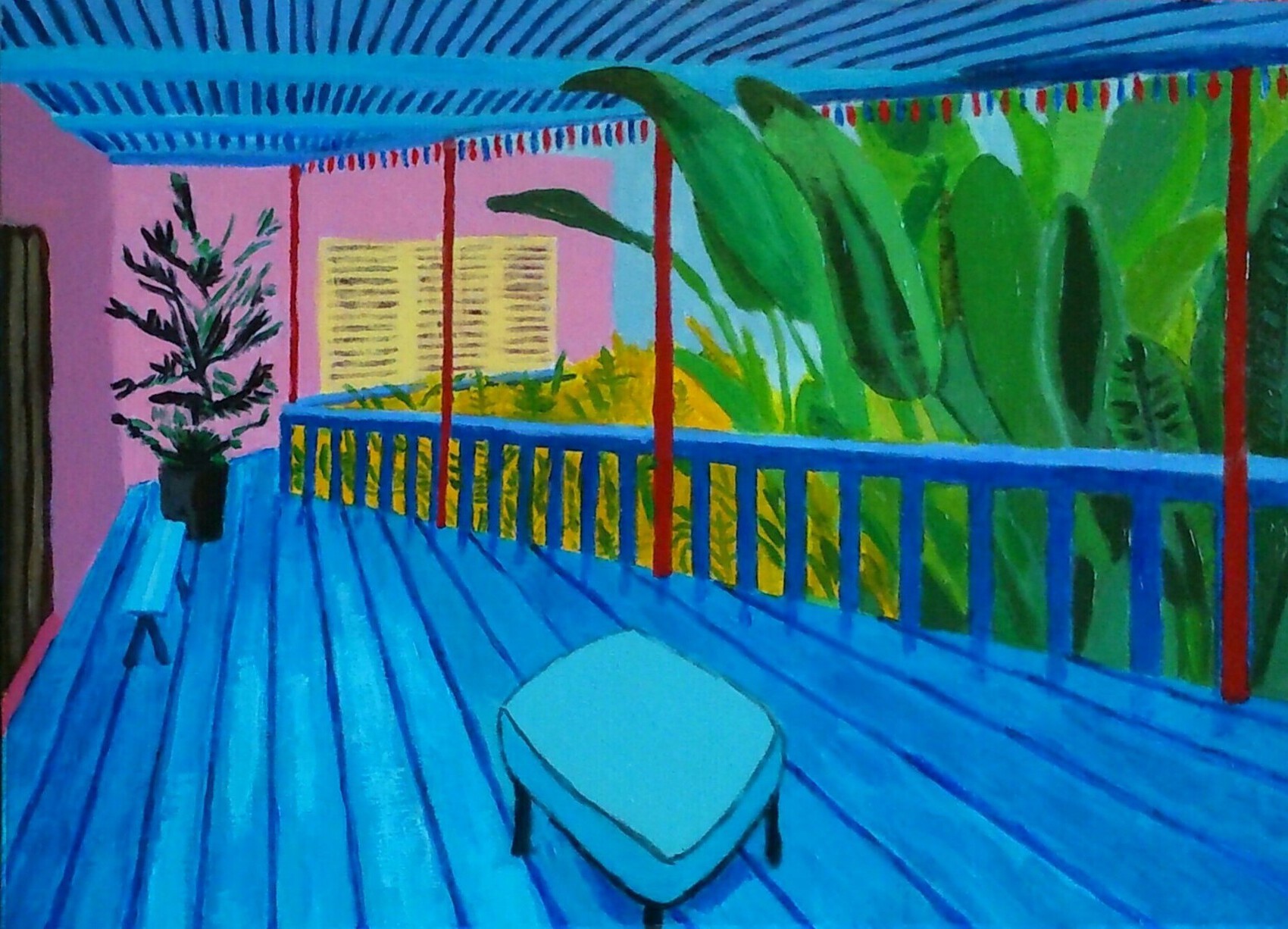 Terrasse Bleue. Acrylique, toile carton 30 x 24 cm. Modèle de David Hockney, Jardin avec terrasse bleue, 2015. Le privilège des grands, c'est de voir les catastrophes d'une terrasse. (Jean Giraudoux) Le paradis, c’est d’être assis à la terrasse un soir d’été et d’écouter le silence. (Alec Guinness) https://www.artpal.com/cothy-art1