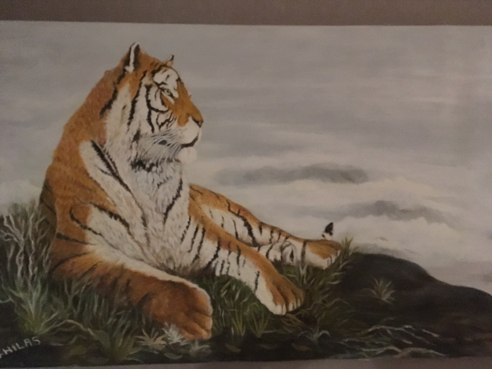 huile sur toile de 120cmx63cm, c'est un tigre qui scrute les montagnes de Corée