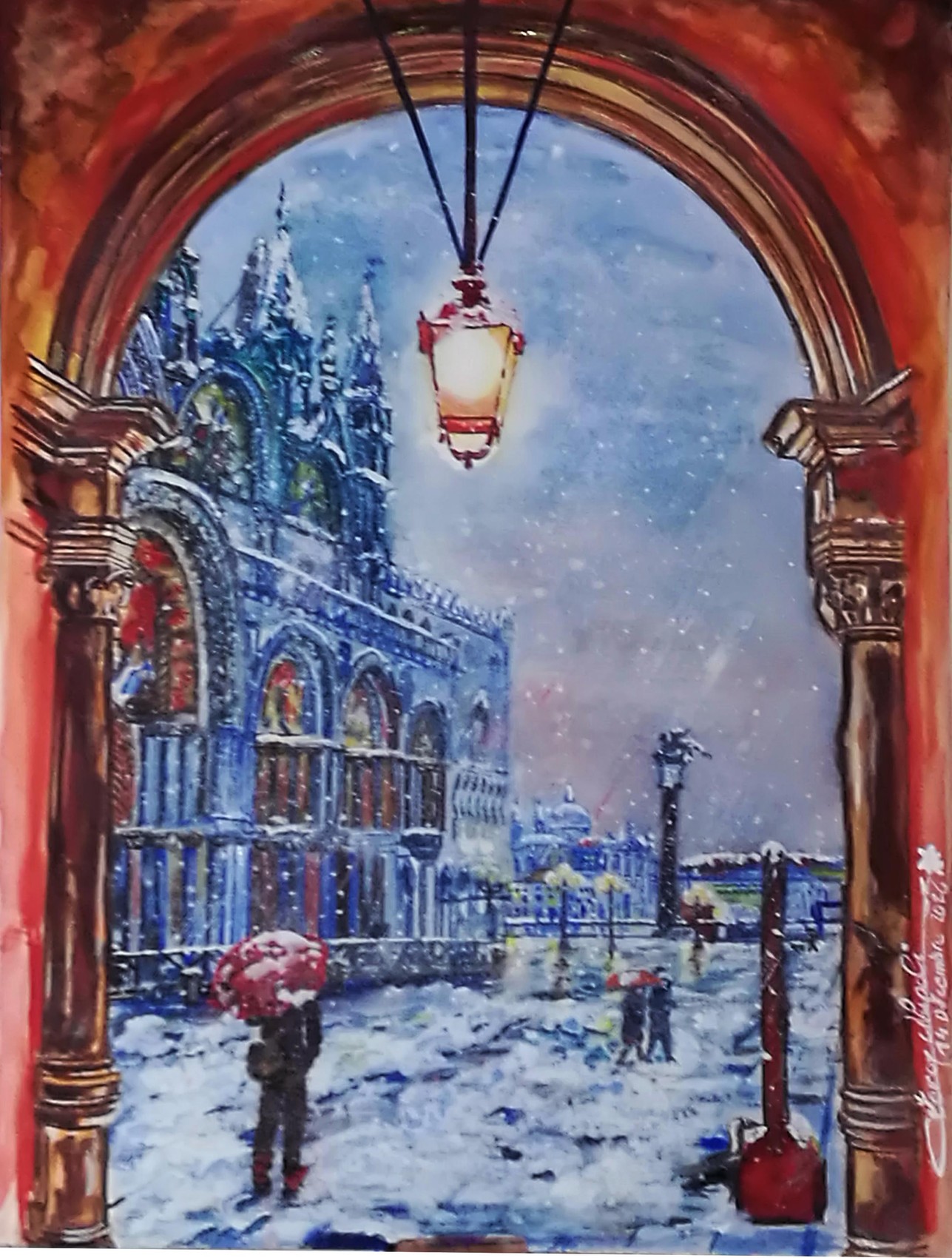 Superbe paysage enneigé! Cette aquarelle est magnifique et de plus, composée de parapluie comme j'aime.