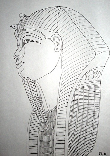 Masque funéraire de Toutankhamon. Dessin à l'encre noire sur papier.