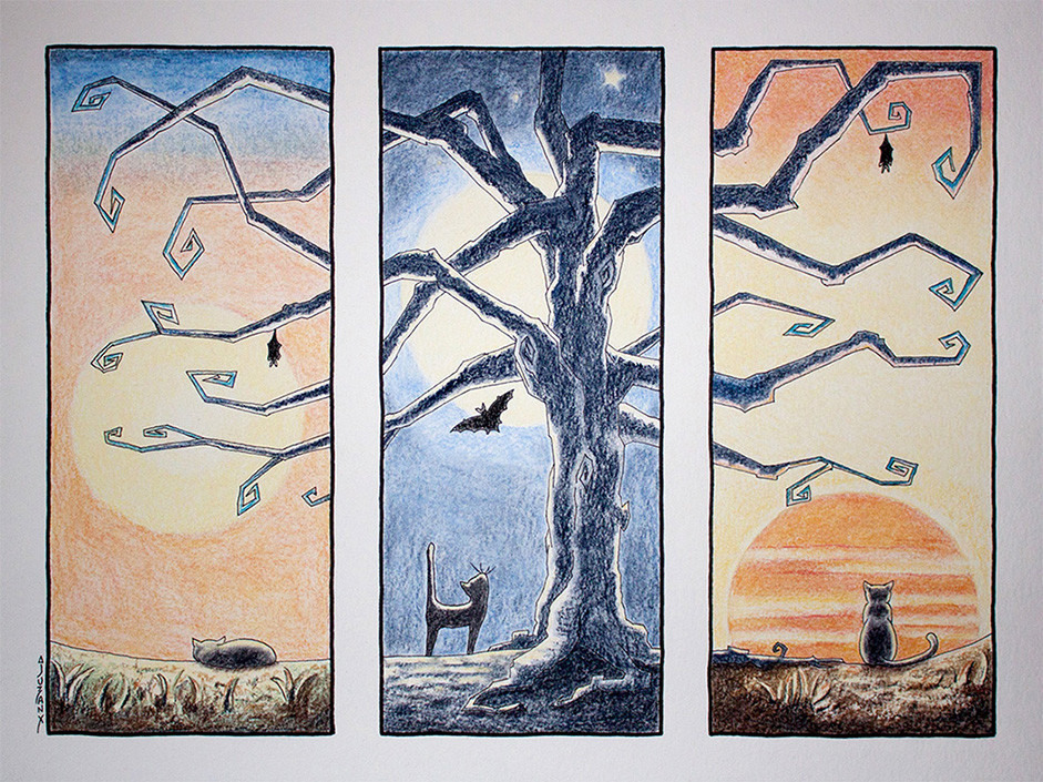 Feutre noir et pastels secs sur papier bambou. 30cm x 40cm