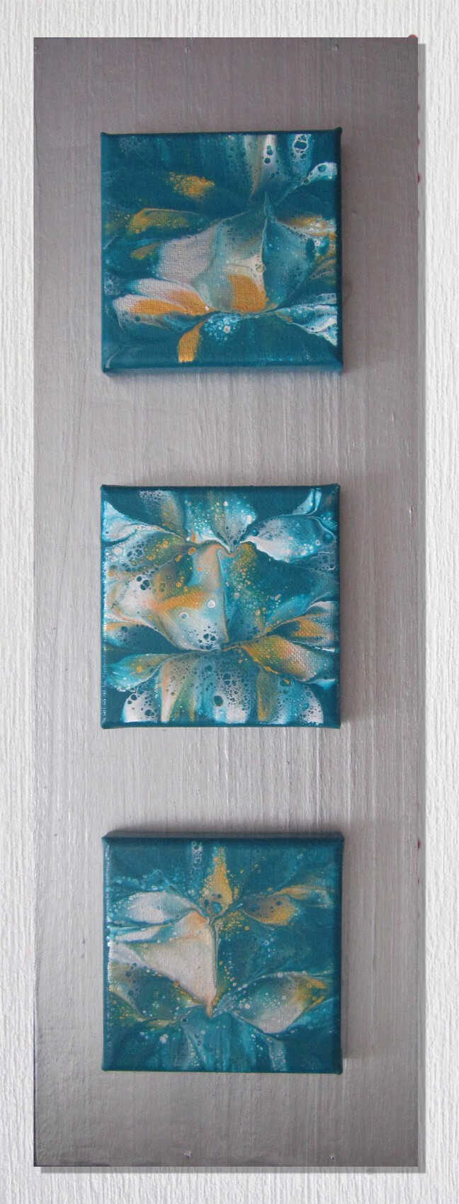 3 toiles de 10x10cm sur planche dim 50x17cm