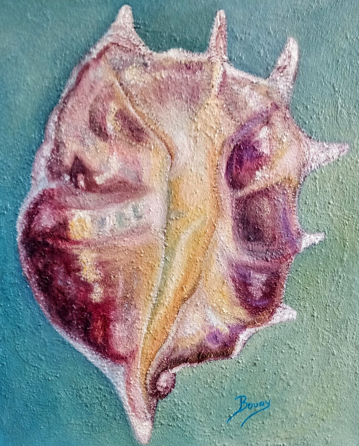 HUILE SUR TOILE COQUILLAGE TROUVÉ SUR LA PLAGE DE TUBUAI EN POLYNÉSIE.