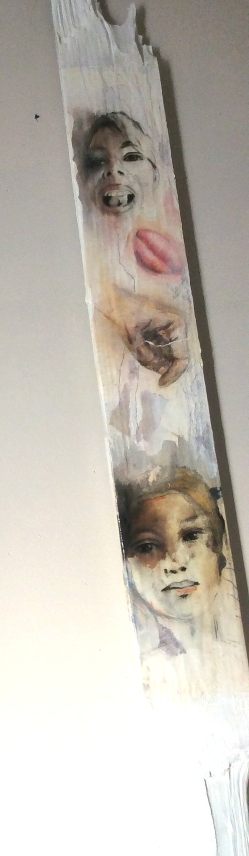 des fragments anonymes émergeant de l'espace support; l'oeil qui s'attarde sur un fragment représenté, puis un autre, est amené à prendre en compte l'ensemble présenté et s'interroger sur l'identité. peinture à l'huile sur papier, marouflé sur bois 2015