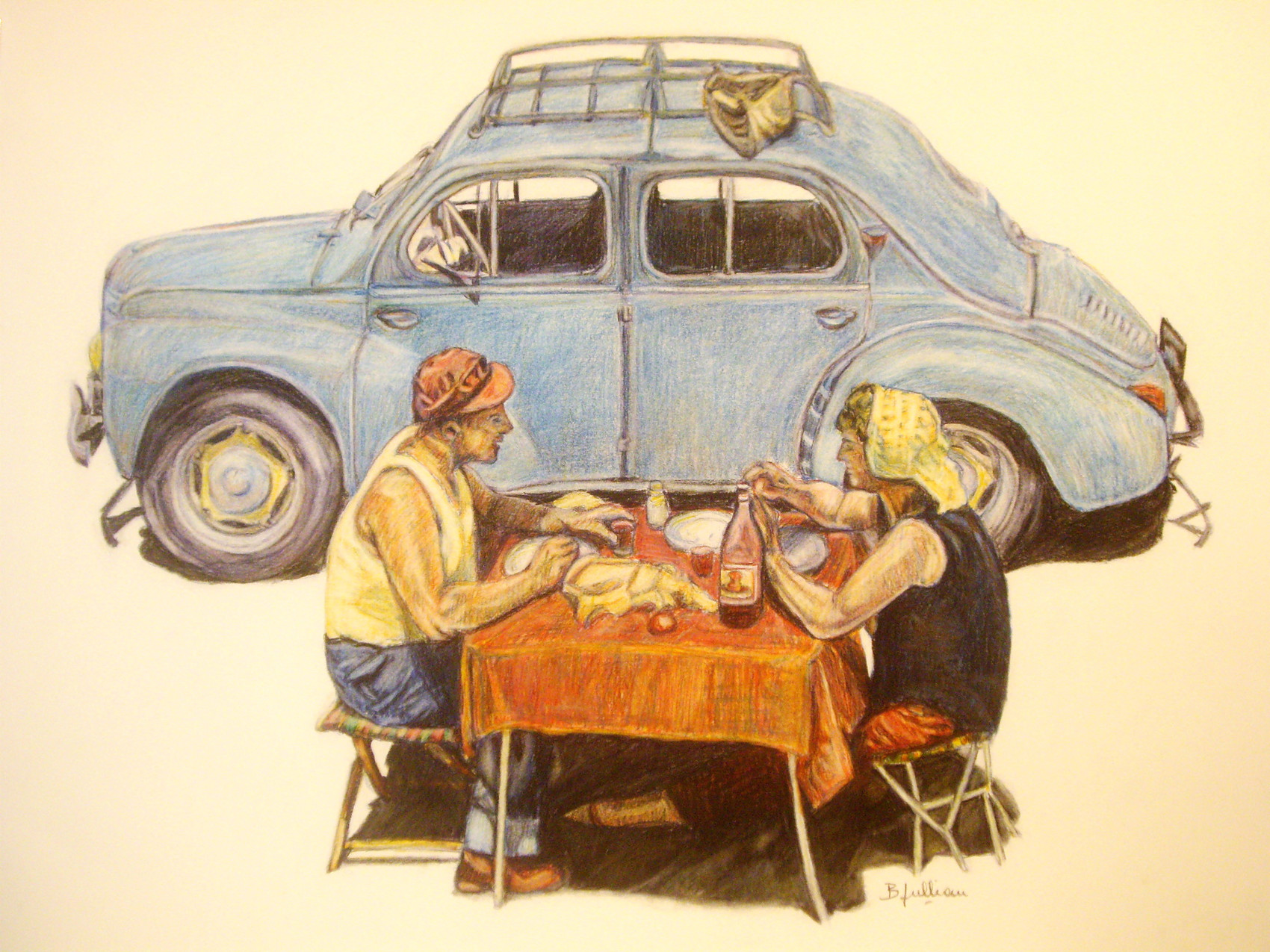 DESSIN COULEURS sur Papier CANSON Format Raisin (50 X 65 cm) , realise au crayon sec par l'Artiste Bernard JULLIAN DESSIN ORIGINAL - avec signature de l'Artiste, UN PIQUE NIQUE sous les 30 Glorieuses