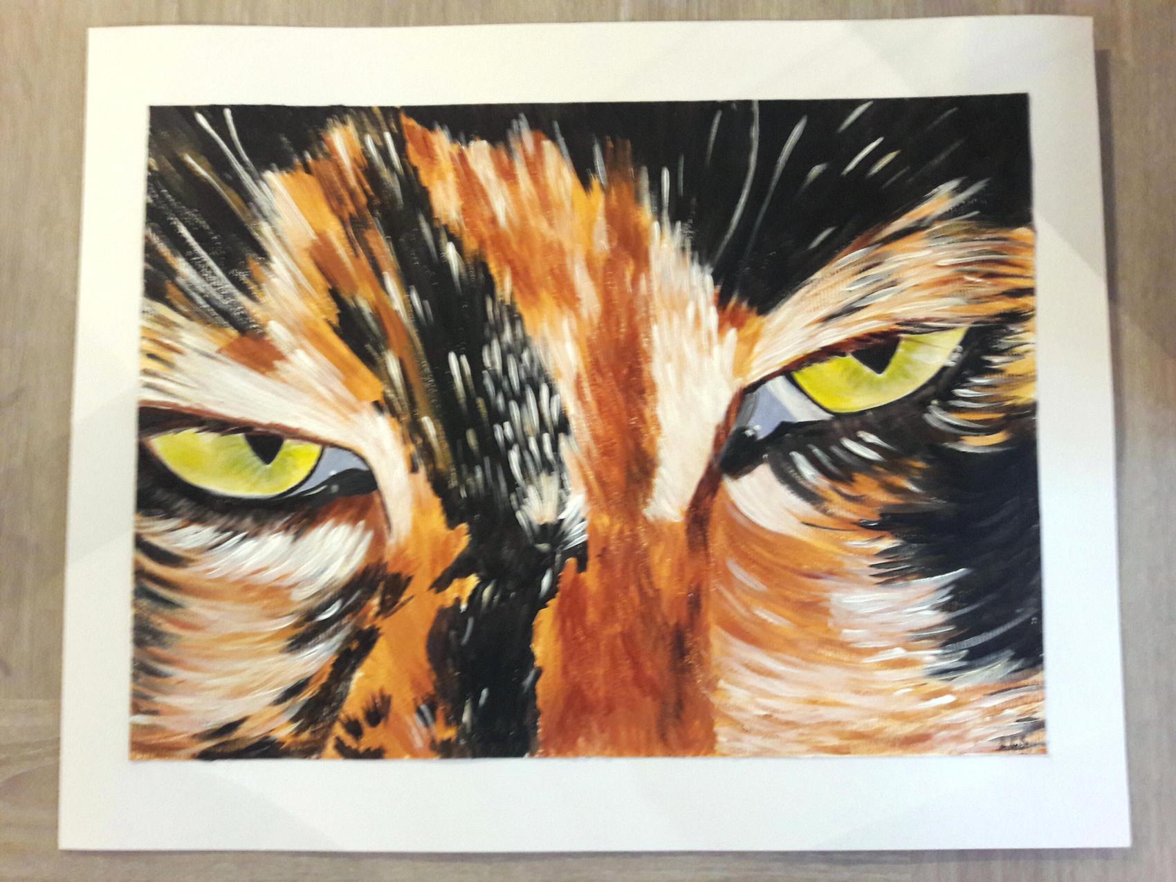 Chat " écailles de tortue au regard intense" réalisé à l'acrylique sur papier et sous verre. Dimensions:40 X 50cm