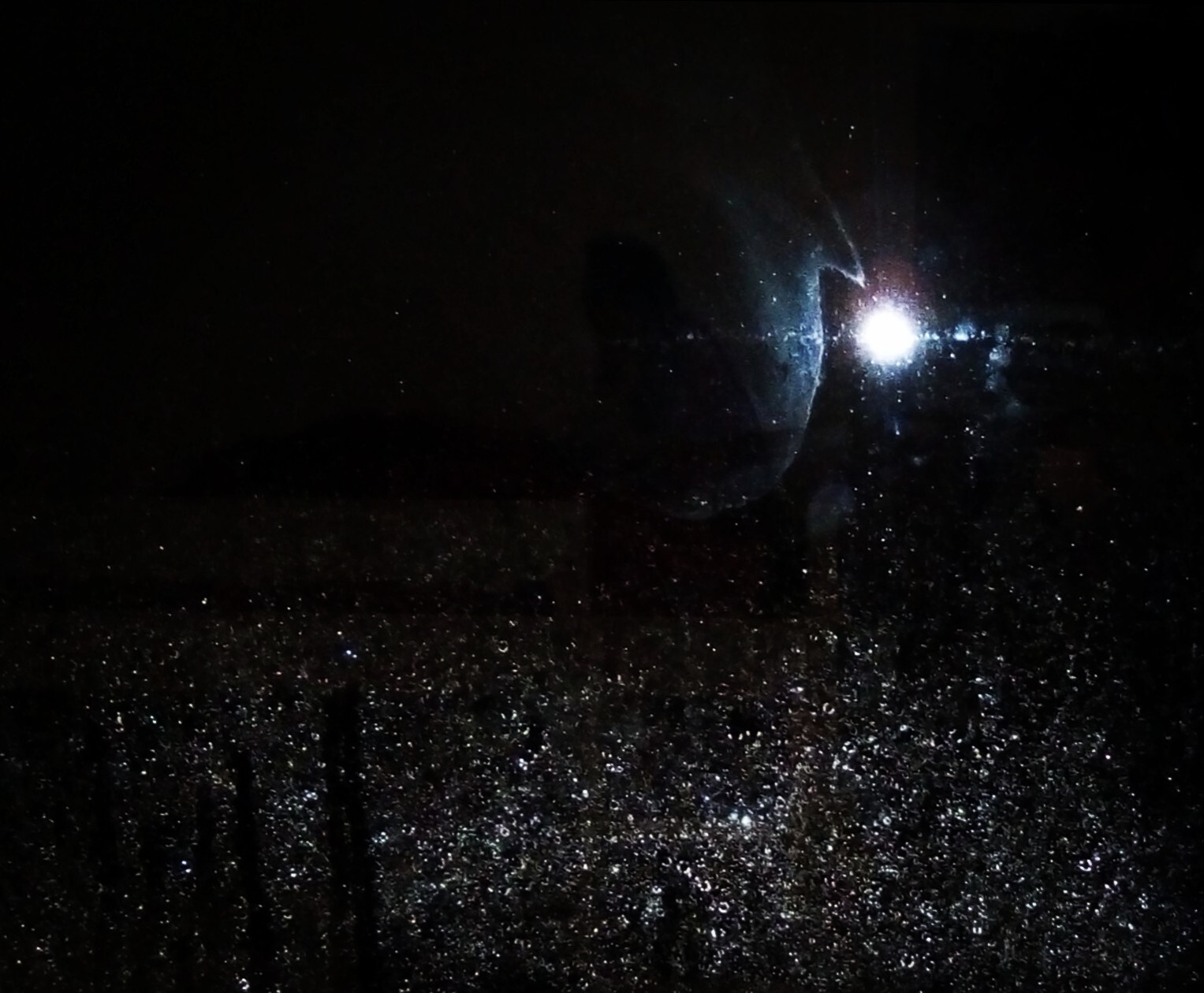 Photo de la pluie en pleine nuit sur ma fenêtre, le flash de mon téléphone représente la lune et une silhouette apparaît dans ce décor.
