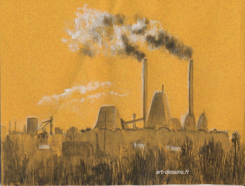 Dessin d'une usine, réalisé sur un papier teinté, au pinceau et à l'encre de chine, et un peu d'encre blanche pour la fumée.