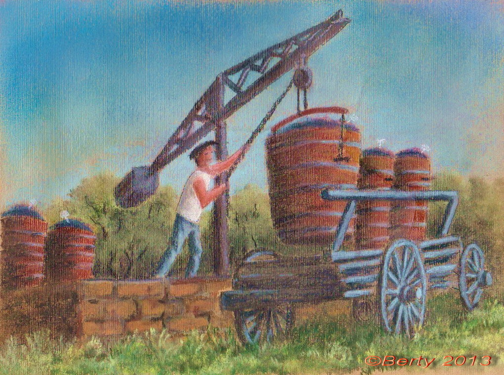 Avant la mécanisation le raisin était récolté a la main par de joyeuses troupes et vidé en bout des vignes dans ces futs de chène appellés douils.Emplis,ils étaient conduits par 4 ou 5 sur une charette tirée par deux chevaux et ensuite des tracteurs et déposés a l'aide d'une petite grue munie d'un palan car plein de raisin un douil pesait environ 800kg sur des petits quais construits dans chaque village ou un vieux camion passait deux fois par jours faire le ramassage direction la coopérative.