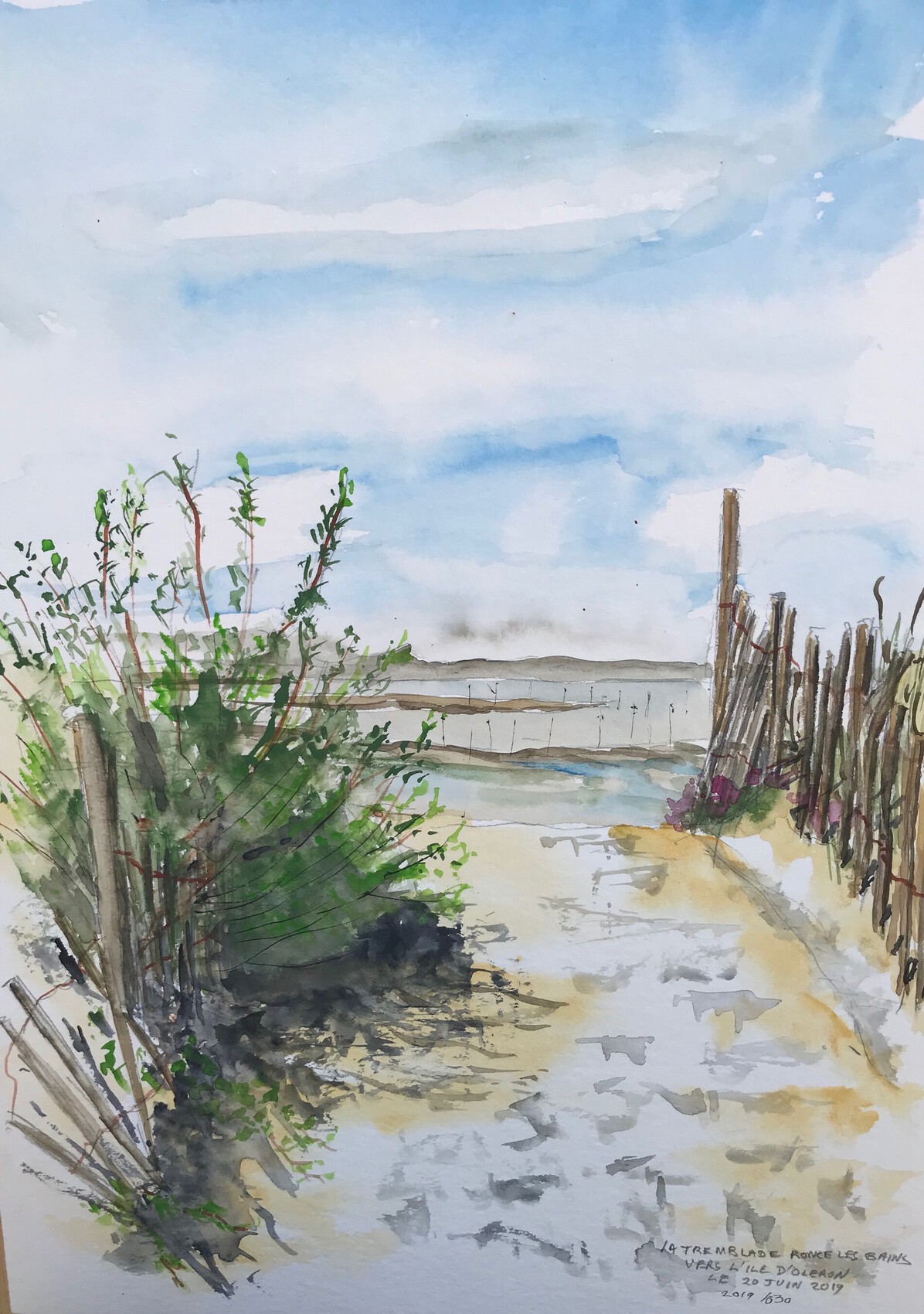 aquarelle réalisée sur site le 20 juin 2019 à La Tremblade Ronce les Bains il s'agit d'un accès à la plage de la Cèpe avec l'ile d'Oléron au fond