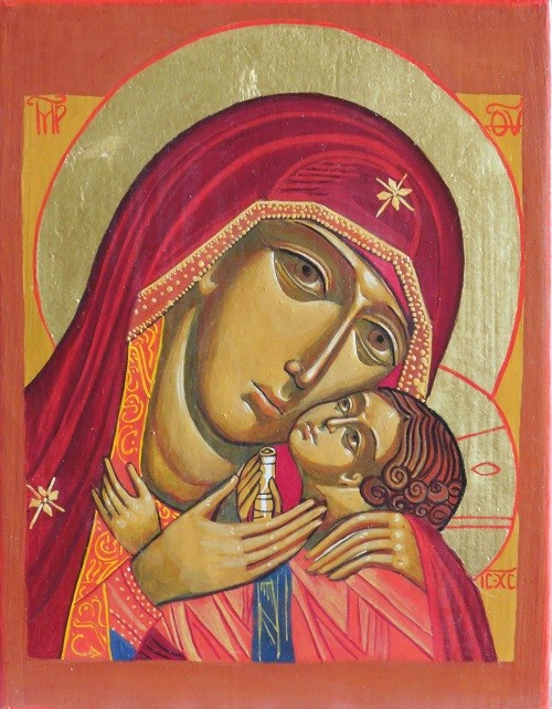 Icône - Planche en bois de tilleul - 24 x 36 cm - Feuille d'or pour les auréoles - Pigments naturels et jaune d'oeuf - Cette icône du XVIIIème siècle tient son nom du lieu de son origine, Korsun (Korssoune), ville portuaire de Russie. La tradition orthodoxe attribue les premières icônes de la Vierge à l'Evangéliste Saint Luc qui en aurait peint 3 après la Pentecôte. Les visages de la Mère et de l'Enfant sont appuyés l'un contre l'autre dans une douce intimité.