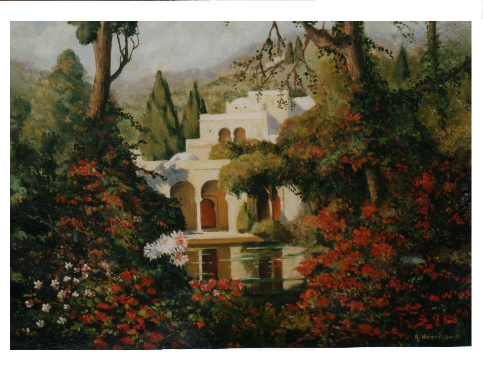 huile/toile réalisée d'apres une oeuvre d'un grand Orientaliste :EUGENE DESHAES qui a séjourné longtemps à Cherchell ,il était impressionné par la beauté de la cote Cherchelloise ,il est parti en France mais il est revenu pour y rester jusqu'a sa mort et il est enterré à l'endroit qu'il à lui meme choisi sur les hauteurs de Tipasa en face de la mer pas loin de Cherchell.