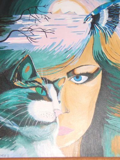 huile sur toile 46cm x 38 cm 2000 représentant un visage féminin et un chat