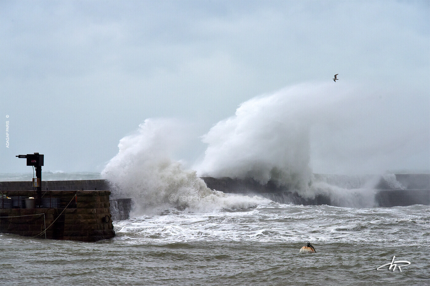 Vol de goéland au dessus de l'agitation dans un port Normand de la Hague