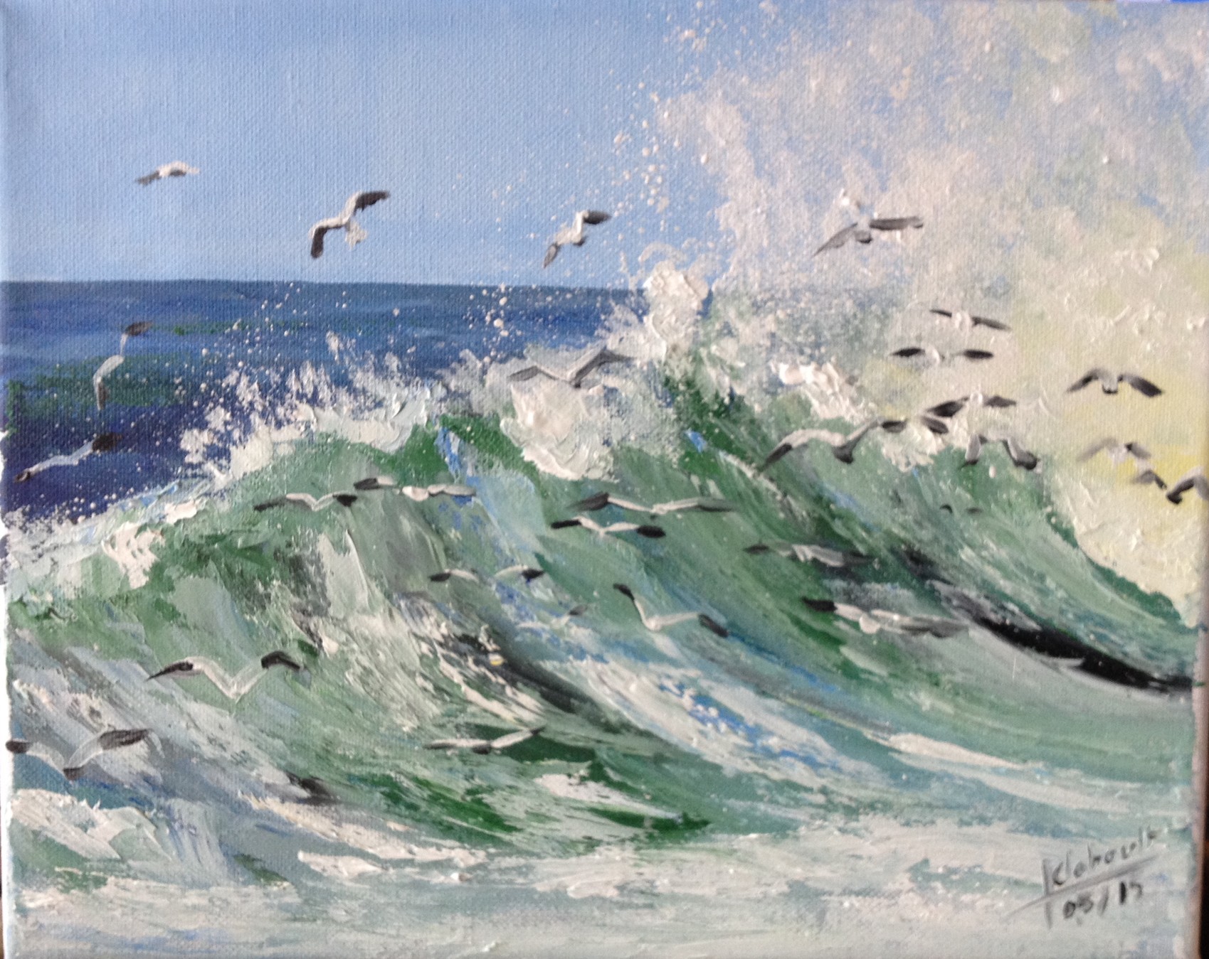 huile sur toile coton 24X30. Brosse et couteau Mouettes sur fond de vague déchainée