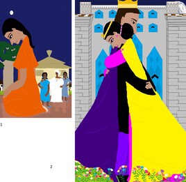 Voici, deux images, tirées d'une illustration de contes et légendes africains par extraits, racontant l'histoire d'une jeune fille orpheline de mère, et qui vivait avec sa marâtre et ses deux demi-soeurs, d'une mauvaise réputation et mauvais caractères mesquins, et un père sans aucun caractère dominé par une femme tyranne et diabolique, bref un récit à la cendrillon africaine, avec des faits singuliers mystiques qui sont propre à la réalité sombre africaine, ainsi l'image vous parle, à gauche, o