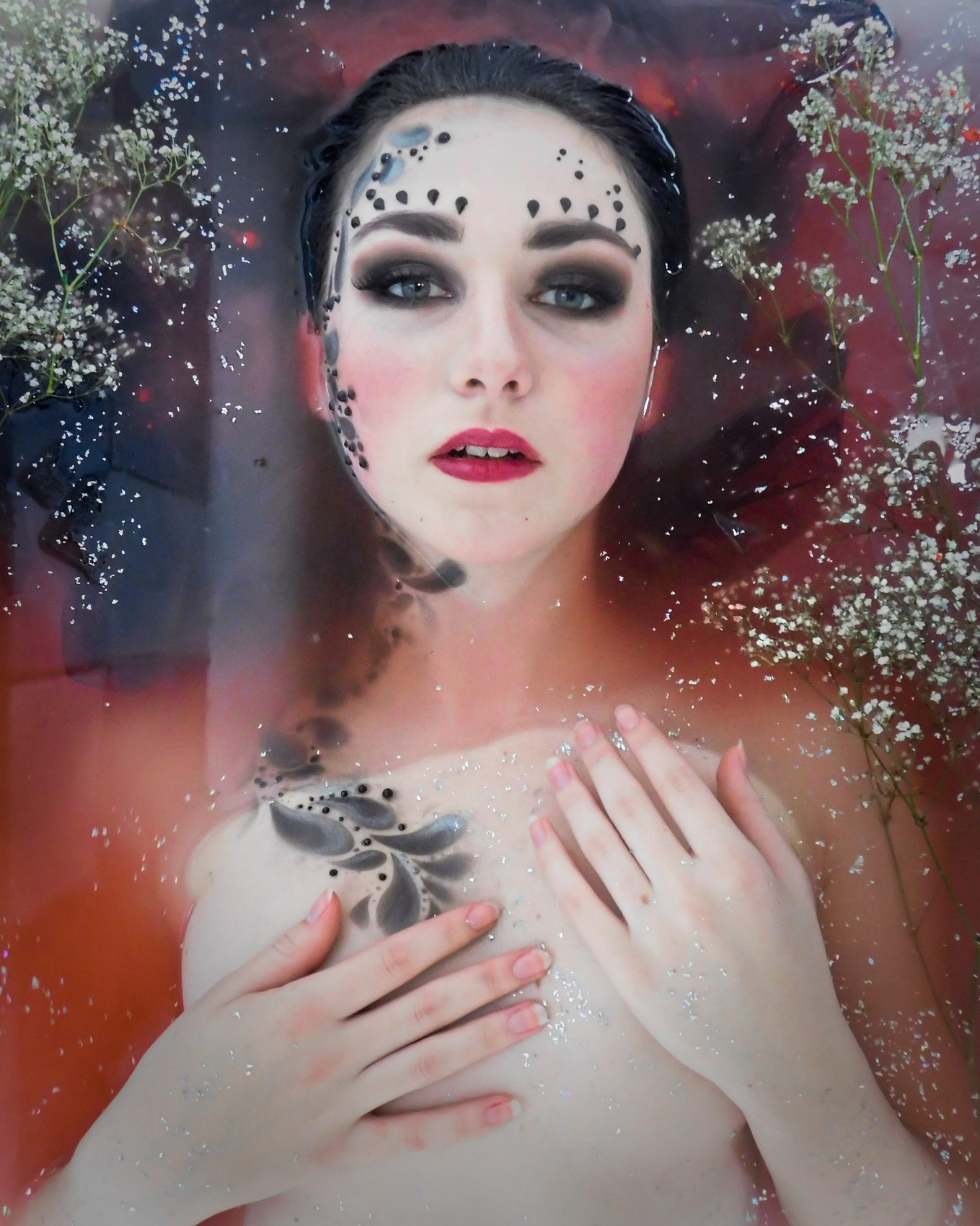 Photographie impression sur toile 60x40. Travail personnel sur les couleurs dans l'eau. Make up artistique réalisé par mes soins