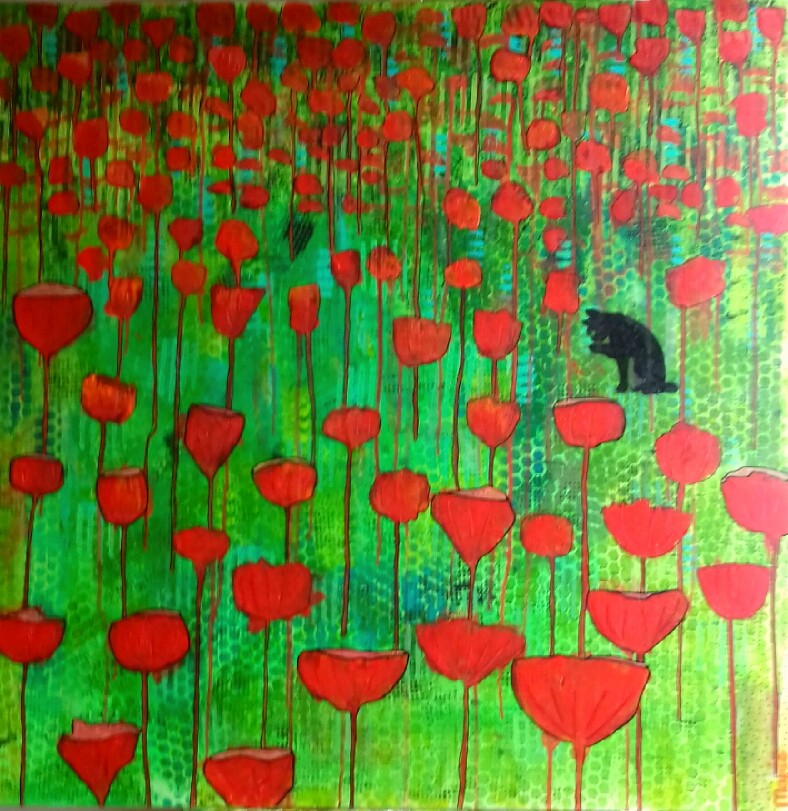J'adore tes titres Mapie et j'adore ce champ de coquelicots avec cette verdure que tu arrives à densifier avec ces petits ronds, comme si tu avais placé un grillage ! Gros bisous Et très lumineuses tes couleurs, tu as bien fait de te lever et le chat, c'est un peu ta signarure!!!
